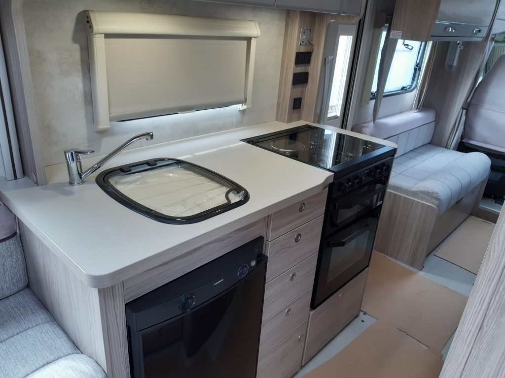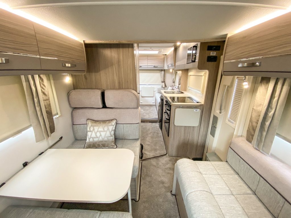Inside the motorhome the rear Lounge area can convert into a double bed, along with a double electric drop-down bed above the dinning area and the ability to convert the dinning area into a large double bed gives you a total of 6 berths to play with and there are 6 full travelling seat-belts for safety. The kitchen has a 3 gas burner hob plus 1 electric plate, microwave, Fridge/Freezer, separate grill and oven. The mid washroom houses a shower, sink and toilet. Heating and Hot water are supplied by the new Whale air space and expanse water heating which can use electric or gas. The comfortable bench seats in the dinette convert easily into a double bed and with the 4 dinette seat belts allows 6 people to travel and sleep.